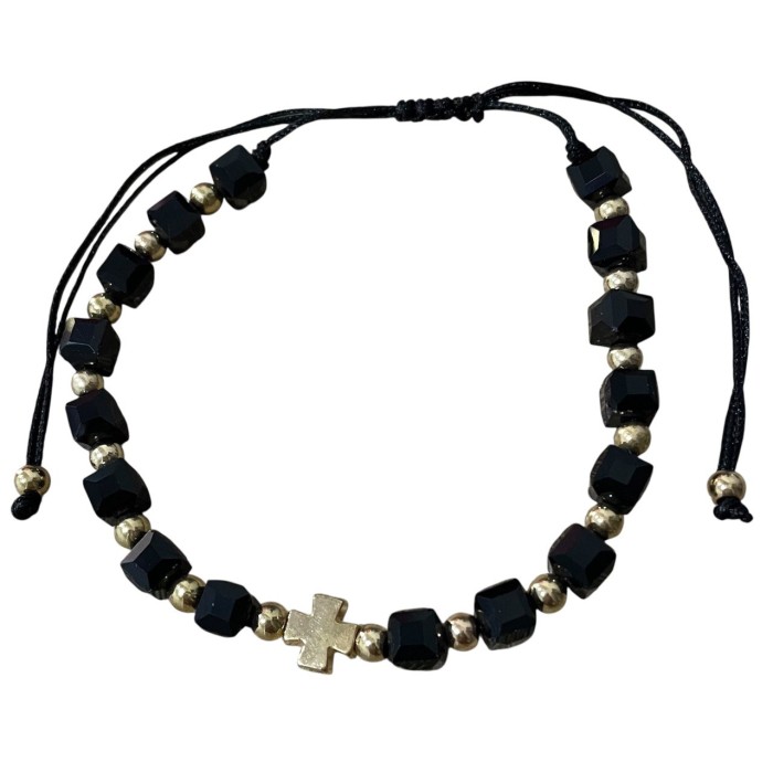 БРАСЛЕТ на затяжці зі скляними гранованими квадратиками та золотистим хрестом і бісером