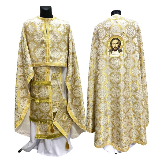 Облачення грецького крою БІЛО-ЖОВТЕ р.54/д.145 Парча "Ікона Спас Нерукотворний "